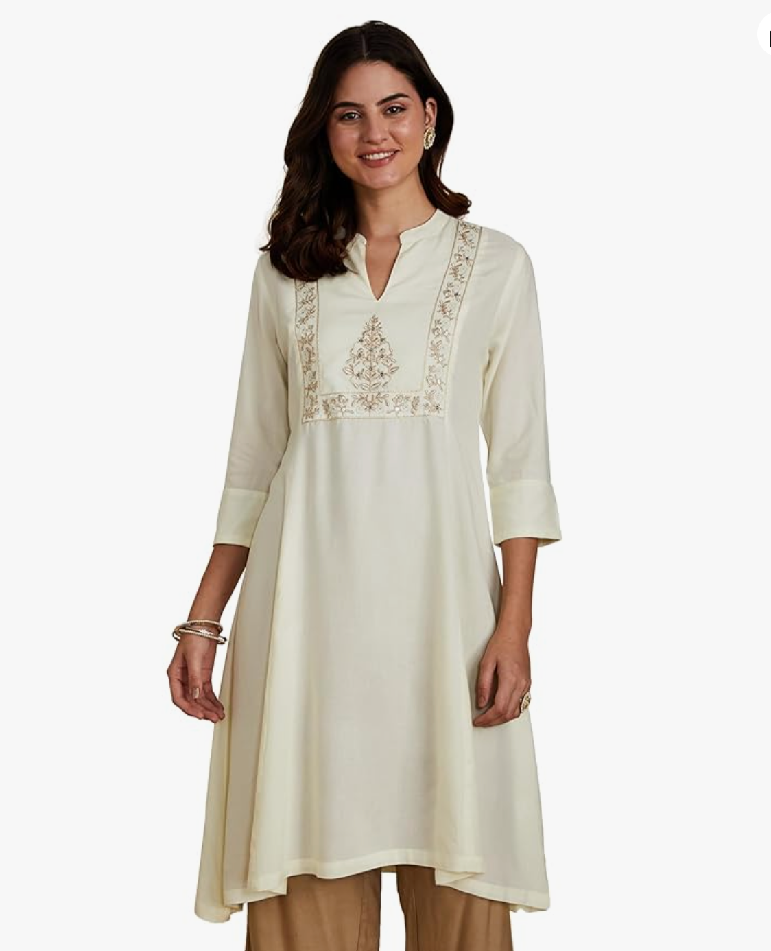 - PRODUCT DETAILS: A-line, knee length kurta featuring zari embroidered yoke with open band collar and 3/4th sleeves.